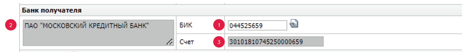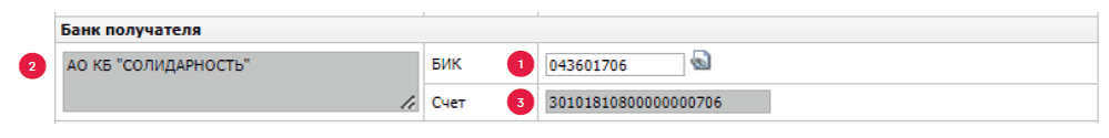 2, 3 — поле «Счет» и наименование банка получателя будут заполнены автоматически из справочника банков после заполнения поля БИК: