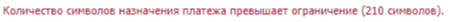 Если после заполнения всех полей, на основе которых автоматически формируется назначение платежа, количество символов в поле 8 «Назначение платежа» превышает 210 и платежное поручение недоступно для сохранения и отправки, на форме выходит подсказка: