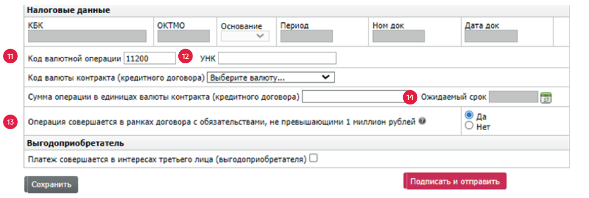 11 — значение в поле «Код валютной операции» введите вручную или используйте справочник кода валют для выбора кода валюты и описания операции.