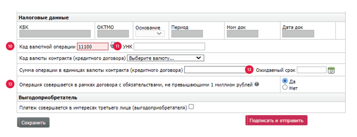 10 — обязательное поле «Код валютной операции». Введите значение вручную или используйте справочник кода валют для выбора кода валюты и описания операции.