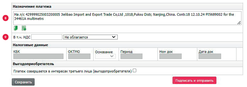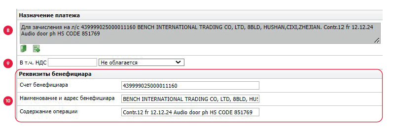 8 — поле «Назначение платежа» неактивно для заполнения. Значение в нем формируется автоматически при заполнении группы полей «Реквизиты бенефициара» (см. подсказку для поля 10), поля для признака наличия НДС (см. подсказку для поля 9), поля «Код валютной операции» (см. подсказку для поля 11).