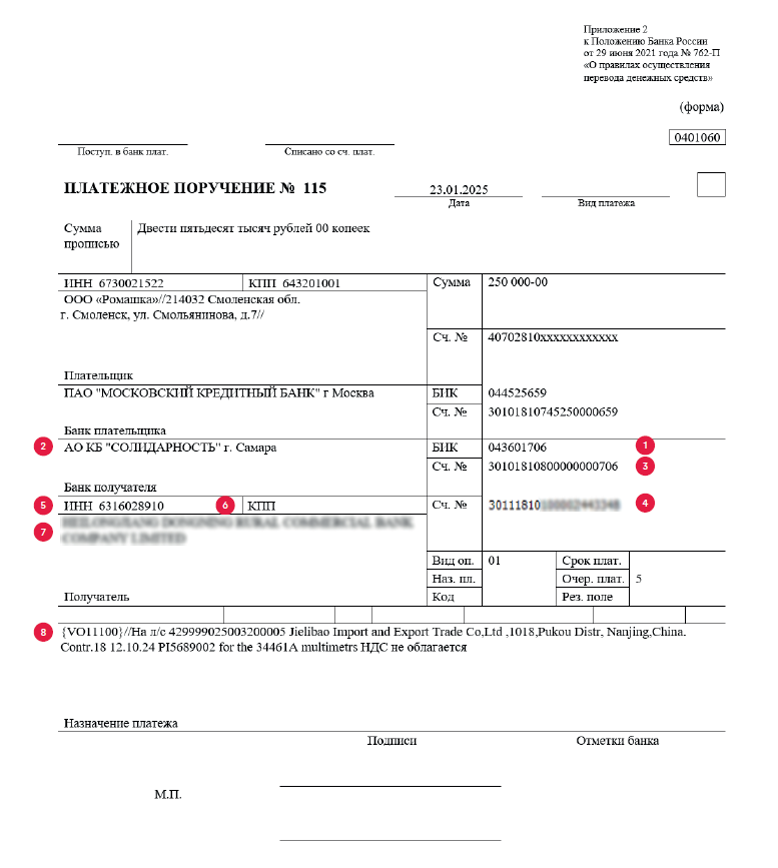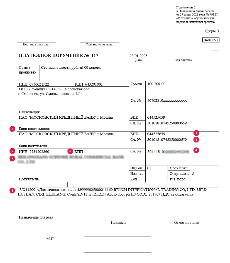 «{VO11200}//Для зачисления на л/с 439999025000011160 BENCH INTERNATIONAL TRADING CO, LTD, 8BLD, HUSHAN, CIXI, ZHEJIANG. Contr.SD-12 fr 12.12.24 Audio door ph НS CODE 851769 НДС не облагается.»