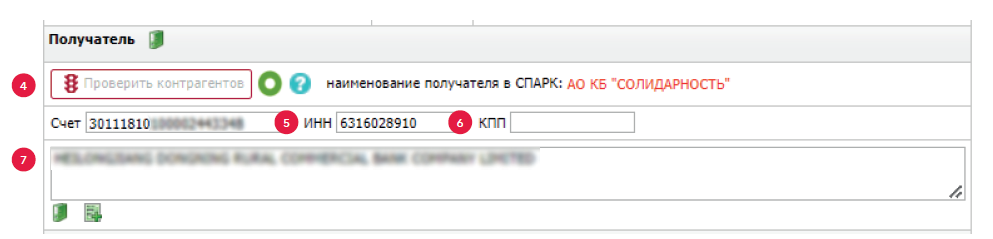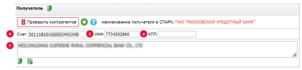 Важно! После заполнения поля «ИНН» проверьте информацию в поле с наименованием получателя. Если значение поля изменилось (появилось наименование российского банка-посредника в РФ), внесите корректные данные — наименование банка-получателя (см. подсказку для поля 7). |