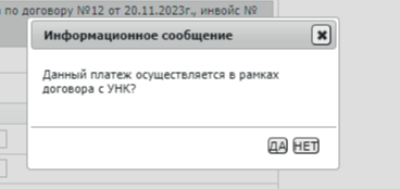 Если код валютной операции предполагает наличие УНК и УНК не был указан, то при попытке отправить или сохранить платеж откроется окно с вопросом о наличии УНК: